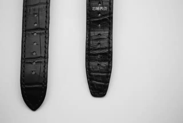 至于表带的差别就更明显了,假表用的是鳄鱼纹牛皮,真表用的是鳄鱼皮表带。假表表带的尾部是尖的,真表是平的。