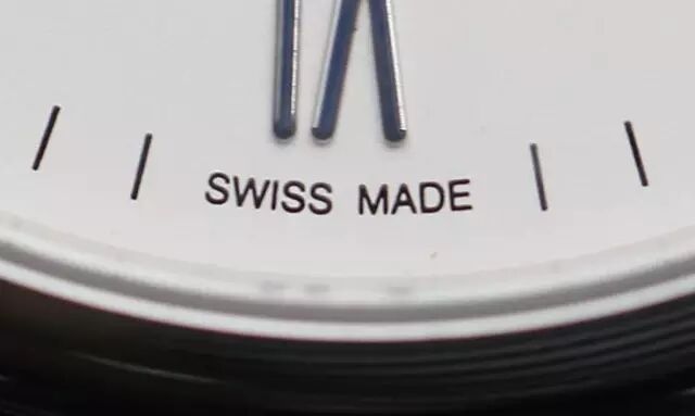 真表“swiss made”中最后一个“s”在六点钟罗马数字第二个金属条的正下方,而假表则在稍左边一点。