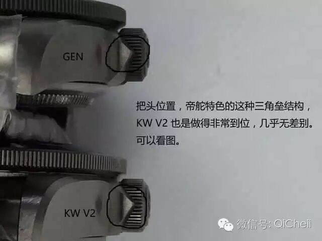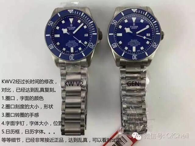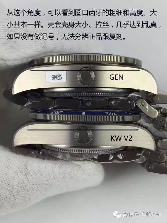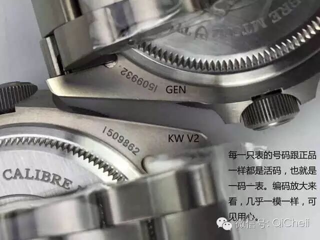 先说的是这款劳力士手表 因为高仿时间最长 所以版本众多。V1版已经在市场上消踪匿迹。从左开始分别是V6 V5 V4 V3 V2 版大家很容易从夜光图的区别 分辨出好坏。V2 版和V3版在图片的区别并不大但实物在细节上还是有挺大落差。商家一般不做这两个版本 重点说V6最简单的区分V6版 就是从日立的蓝膜上。正品的劳力士水鬼在日历的窗口上是附有蓝膜的,不同光线下 是可以明显显示出这个蓝膜。目前只有ETA的机芯改2836 有附蓝膜。只有N厂能有这个技术,因为N厂是最早开始做高仿的厂。在80年代,还可以引进国外设备技术装备技术的时候。N厂是第一个开始做这种高端技术的。