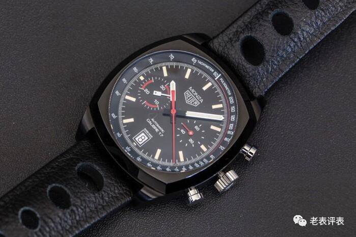 泰格豪雅Heuer Monza复刻计时表,表壳使用黑色涂层覆盖,相当酷,这枚手表复刻自品牌于1976年发行的一枚Monza手表,当时法拉利车队的劳达在1975年赢得世界冠军,这是法拉利首次赢得世界冠军,豪雅是法拉利车队的赞助商,因此推出了Monza复刻手表的原型表。这枚复刻表推出于2016年,同样是一枚限量手表,使用钛金属表壳,42毫米表径,佩戴感觉良好,除了稍微有点厚。