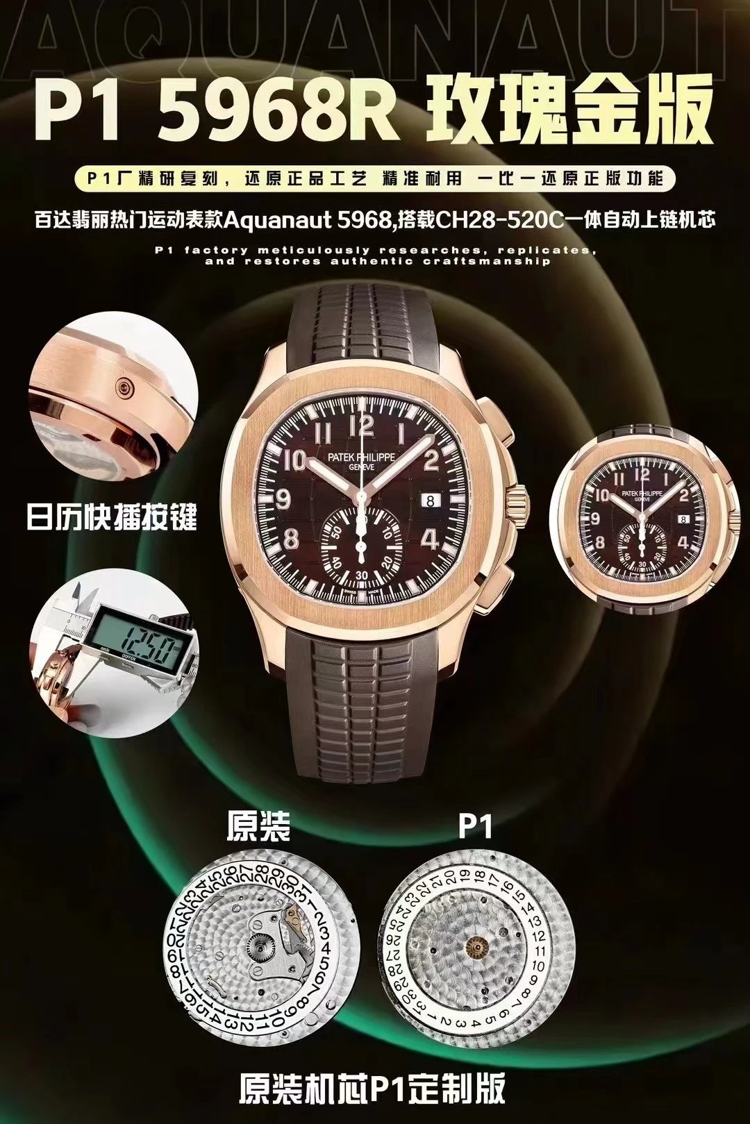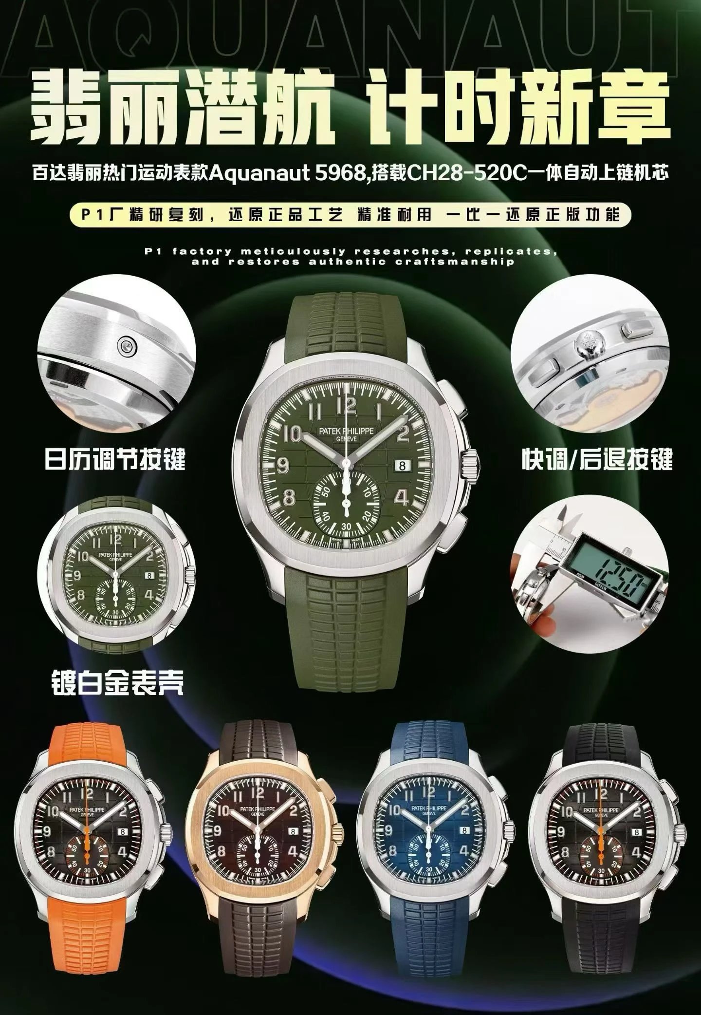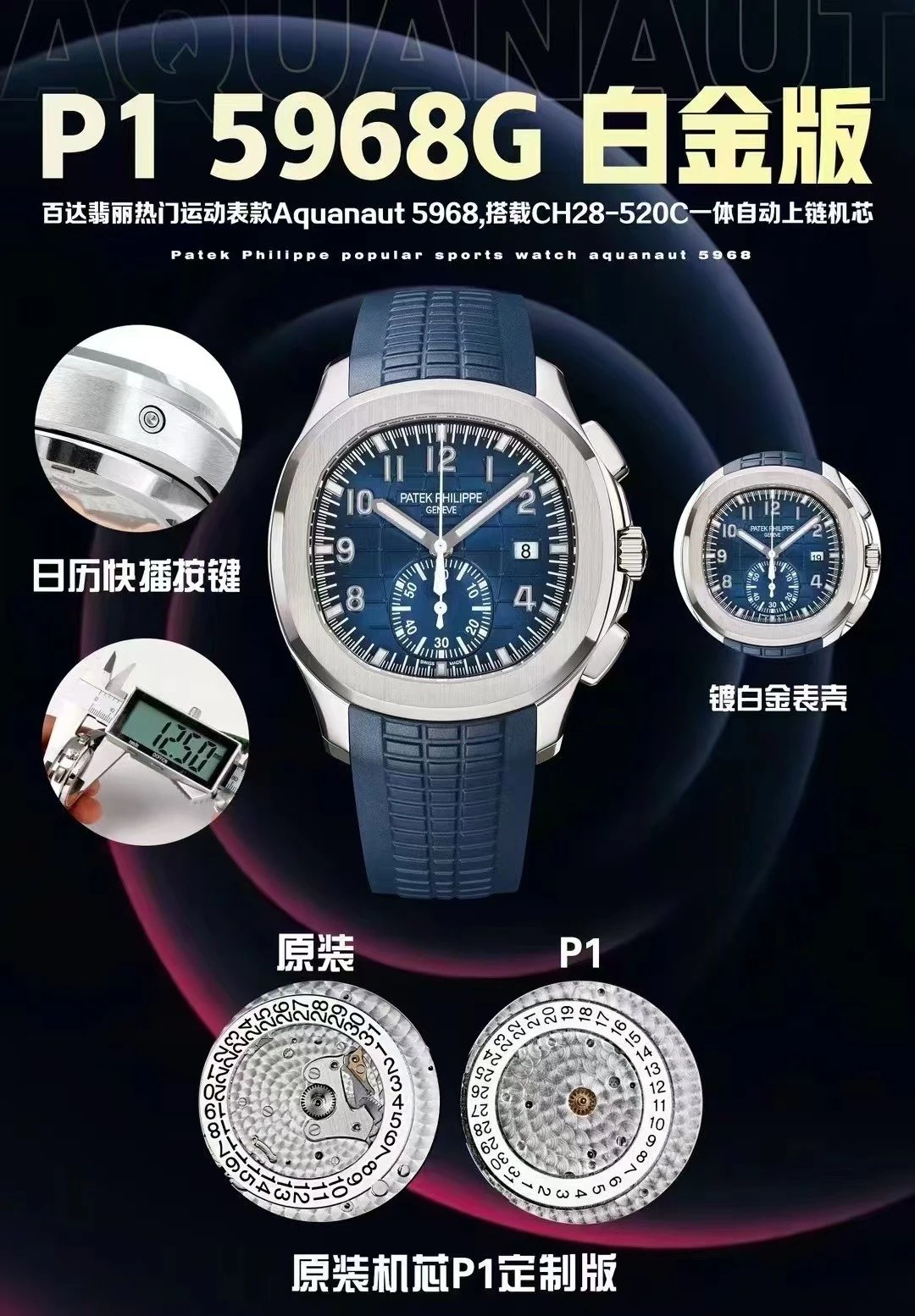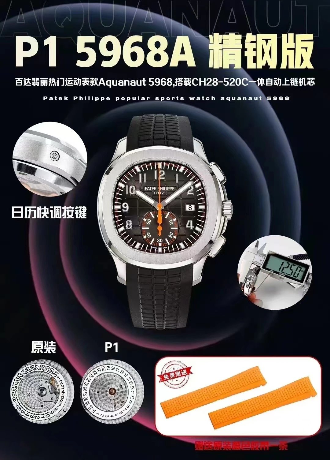 • 5968G-001 藍盤 —— 白金版本,表殼與表扣呈現更亮白的金屬質感,比精鋼更顯高級。• 5968G-010 綠盤 —— 同樣為白金款,外觀亮白醒目。• 5968R-001 棕盤 —— 玫瑰金表殼搭配棕色面盤,呈現奢華屬性。• 5968A-001 黑盤橙針款 —— 精鋼材質,也是市場最熱門的橙針經典版本。為回饋新老客戶,P1廠此款額外贈送開模橙色膠帶一條。