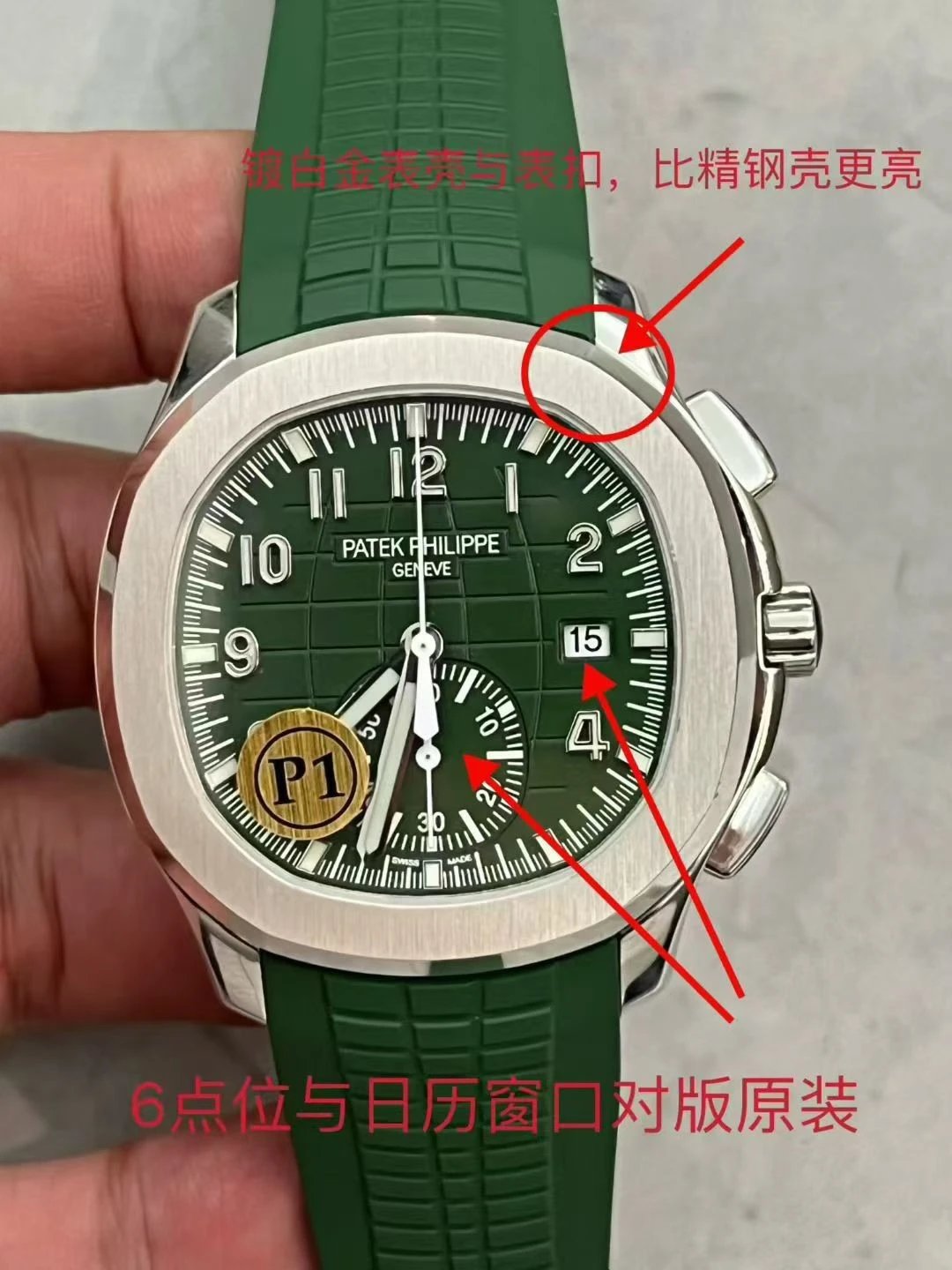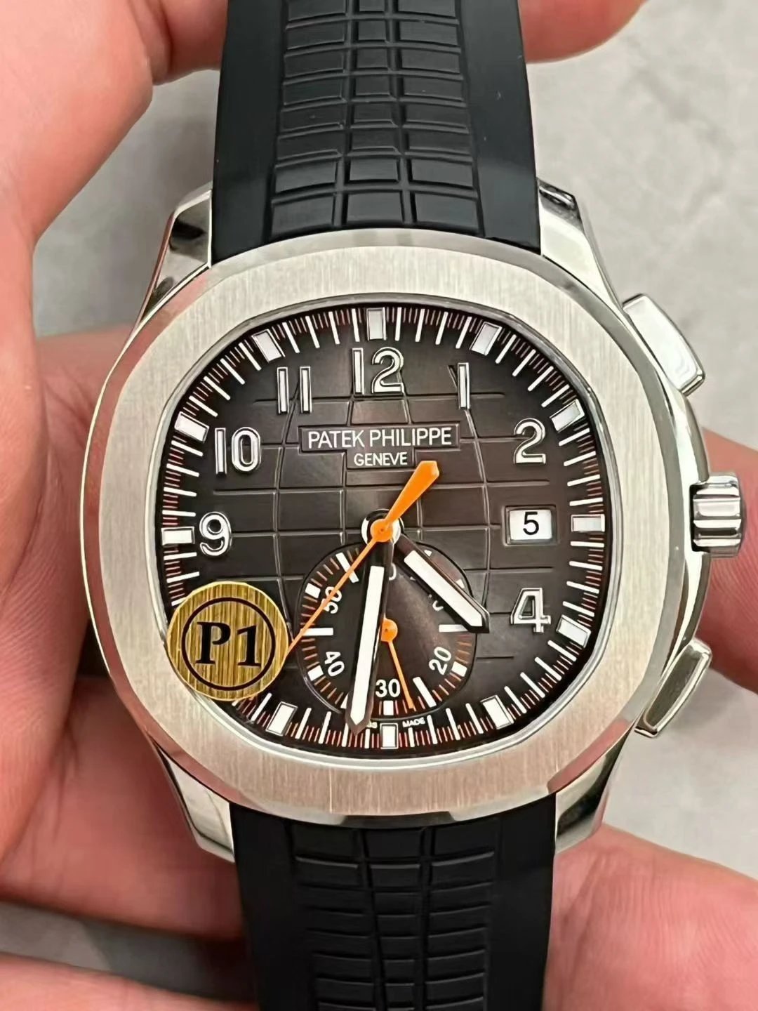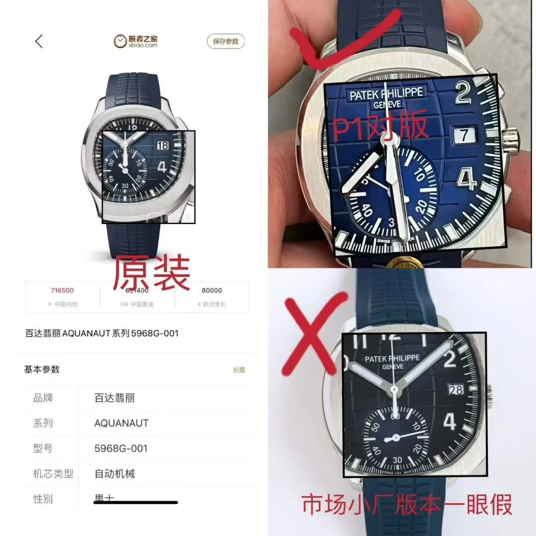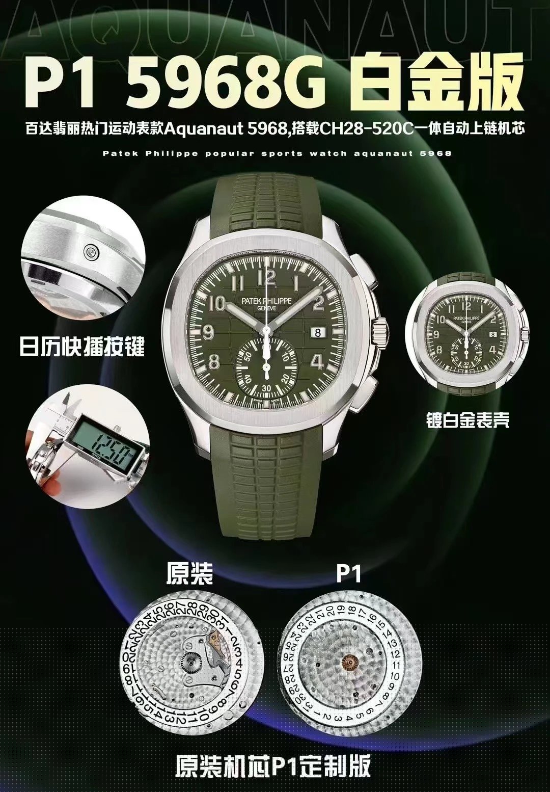 • 5968G-001 藍盤 —— 白金版本,表殼與表扣呈現更亮白的金屬質感,比精鋼更顯高級。• 5968G-010 綠盤 —— 同樣為白金款,外觀亮白醒目。• 5968R-001 棕盤 —— 玫瑰金表殼搭配棕色面盤,呈現奢華屬性。• 5968A-001 黑盤橙針款 —— 精鋼材質,也是市場最熱門的橙針經典版本。為回饋新老客戶,P1廠此款額外贈送開模橙色膠帶一條。